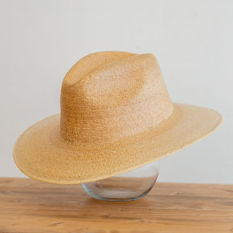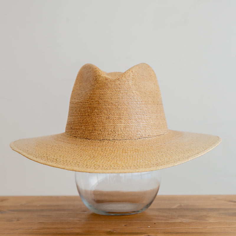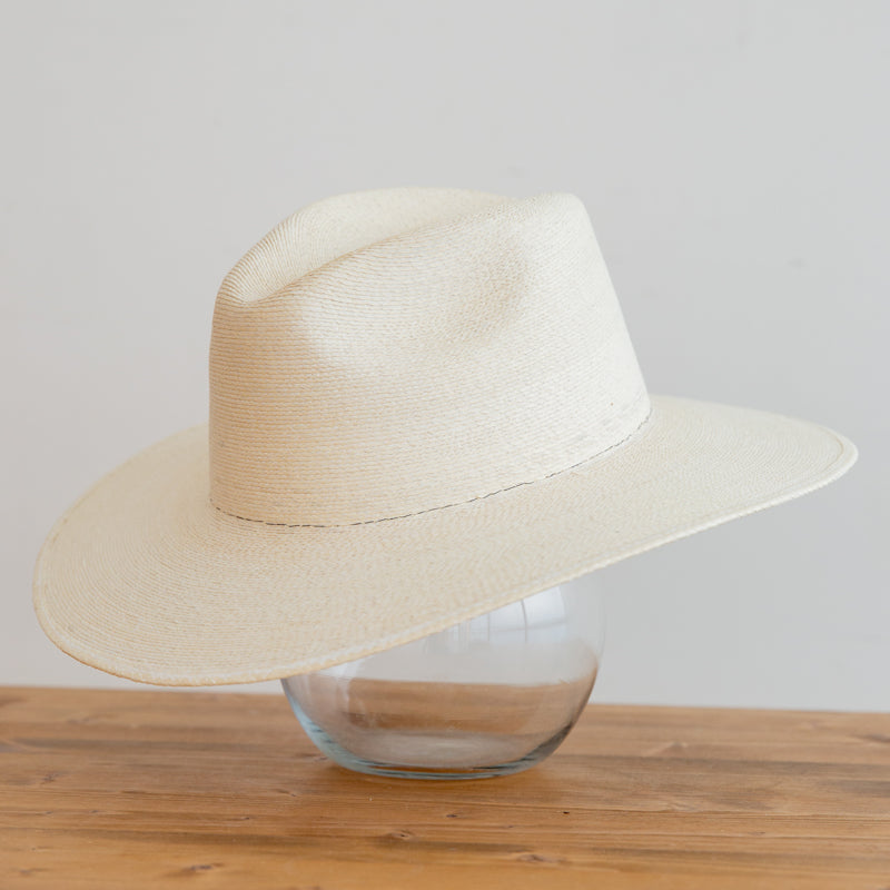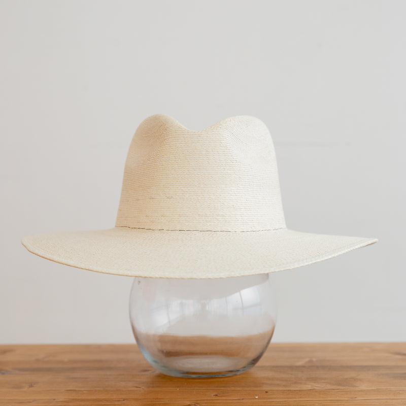 Traditional style hat made of hard palm, not floppy, that dips lower across the forehead to shield from the sun. Add any braided, crochet, satin, rope or suede band with letters to change colors and looks with your fit of the day!