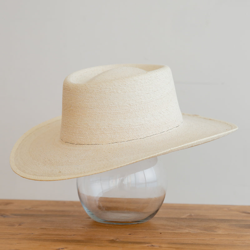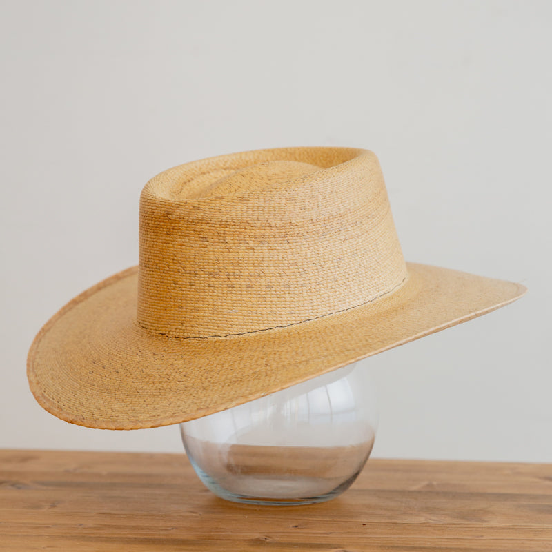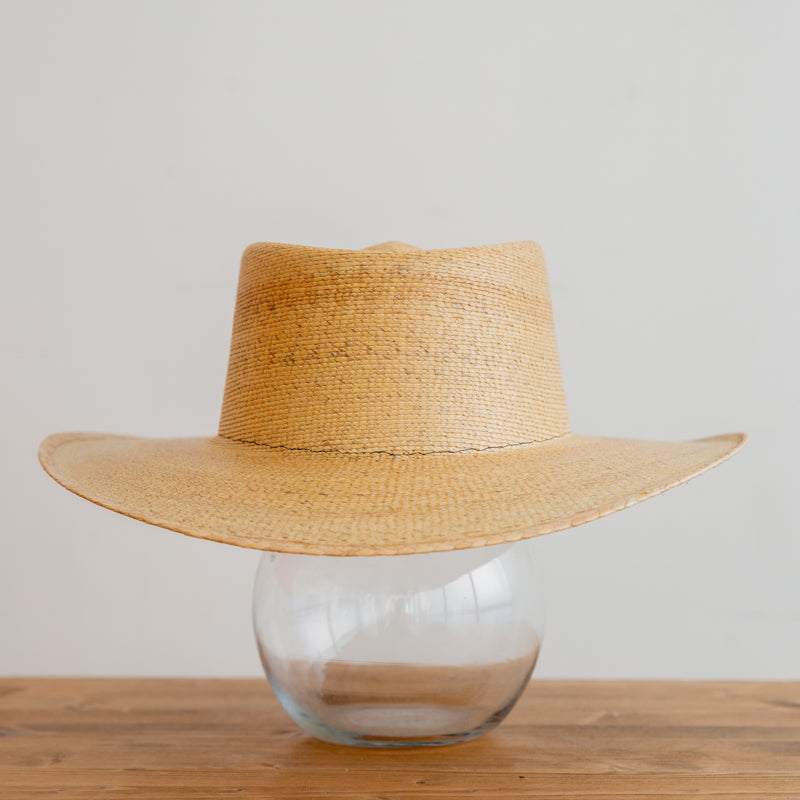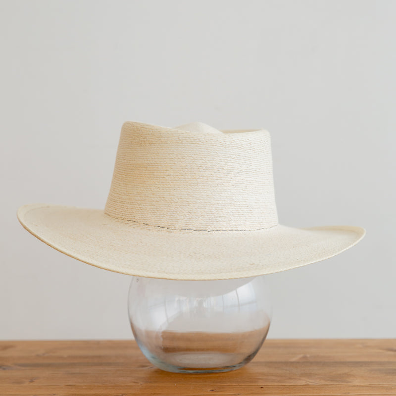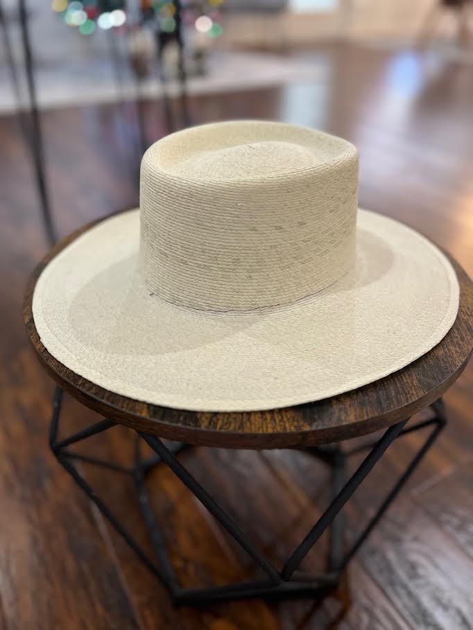 This Basic Queen is part of our build a hat collection. The style has shorter/flat top and the brim dips down front and back and tips up on the sides to frame the face. The Queen comes in both a soft and hard style. Soft is lighter like sun hat, hard has more structure and less bendable. Add any bands to this hat to personalize!