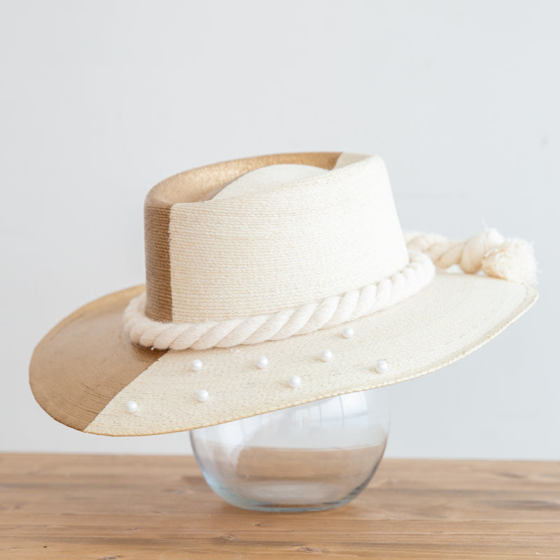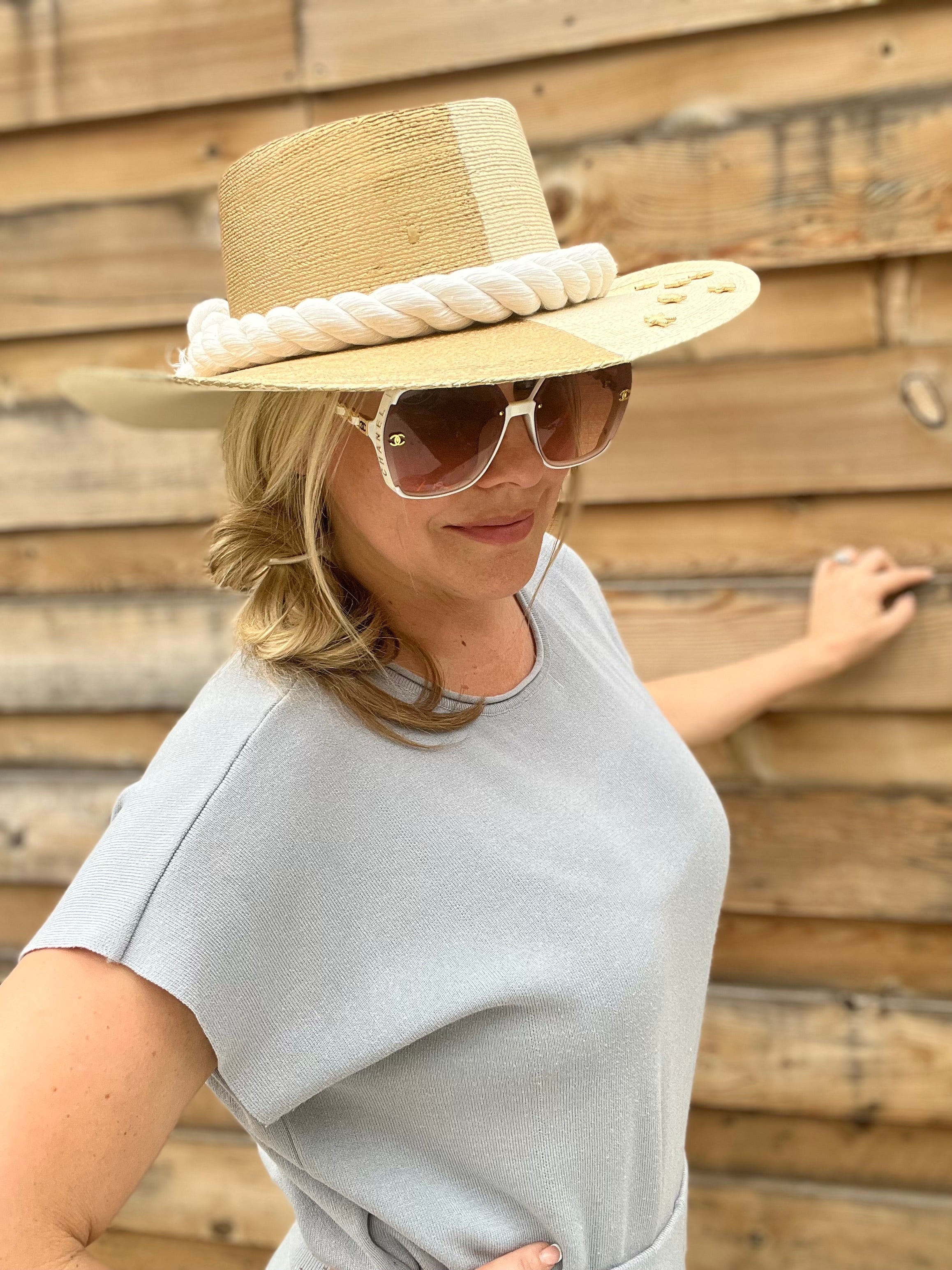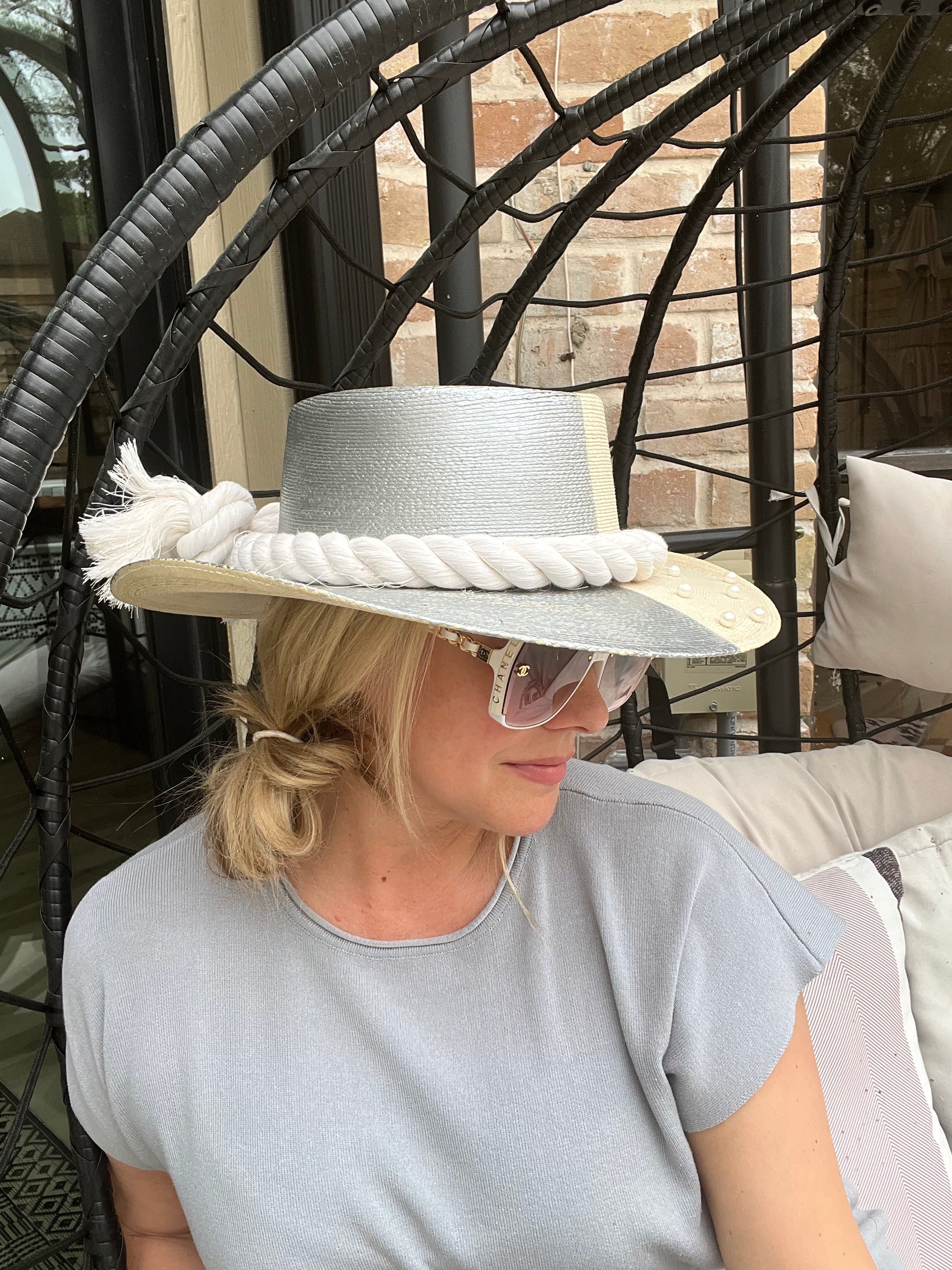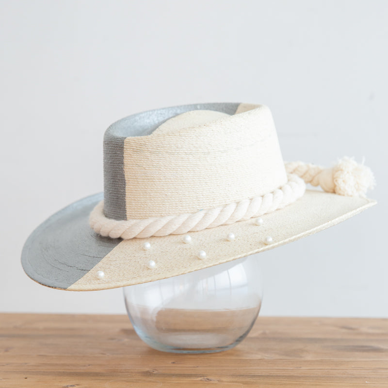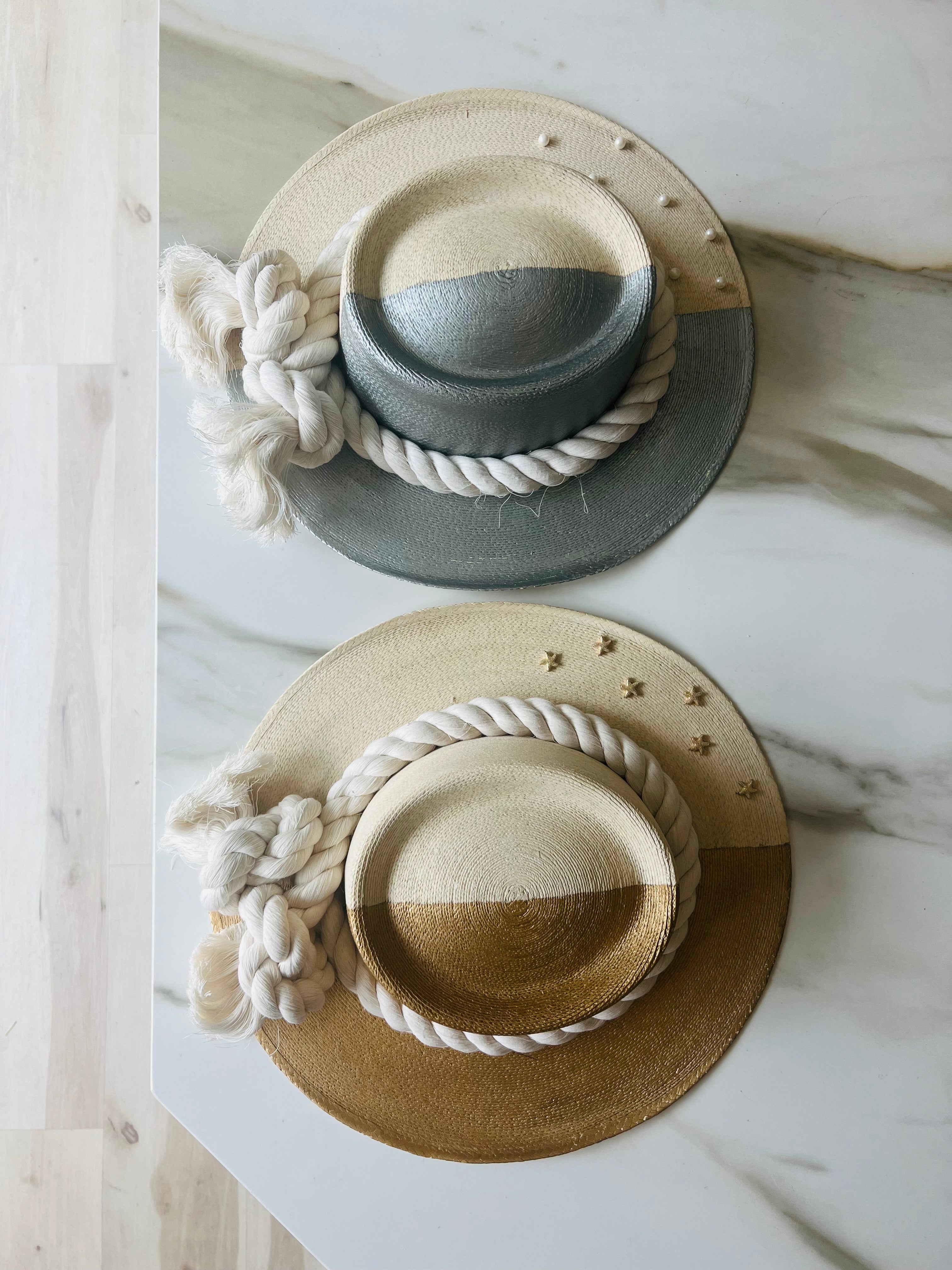 These painted hats are sure to make you the bougiest on the beach. These hard palm hats dip lower in the front and back for sun protection but lift up on the side to show off that beautiful face! They come in silver and gold and are wrapped in a thick white rope. The weight of the hat is perfect to stay on your head on windy days