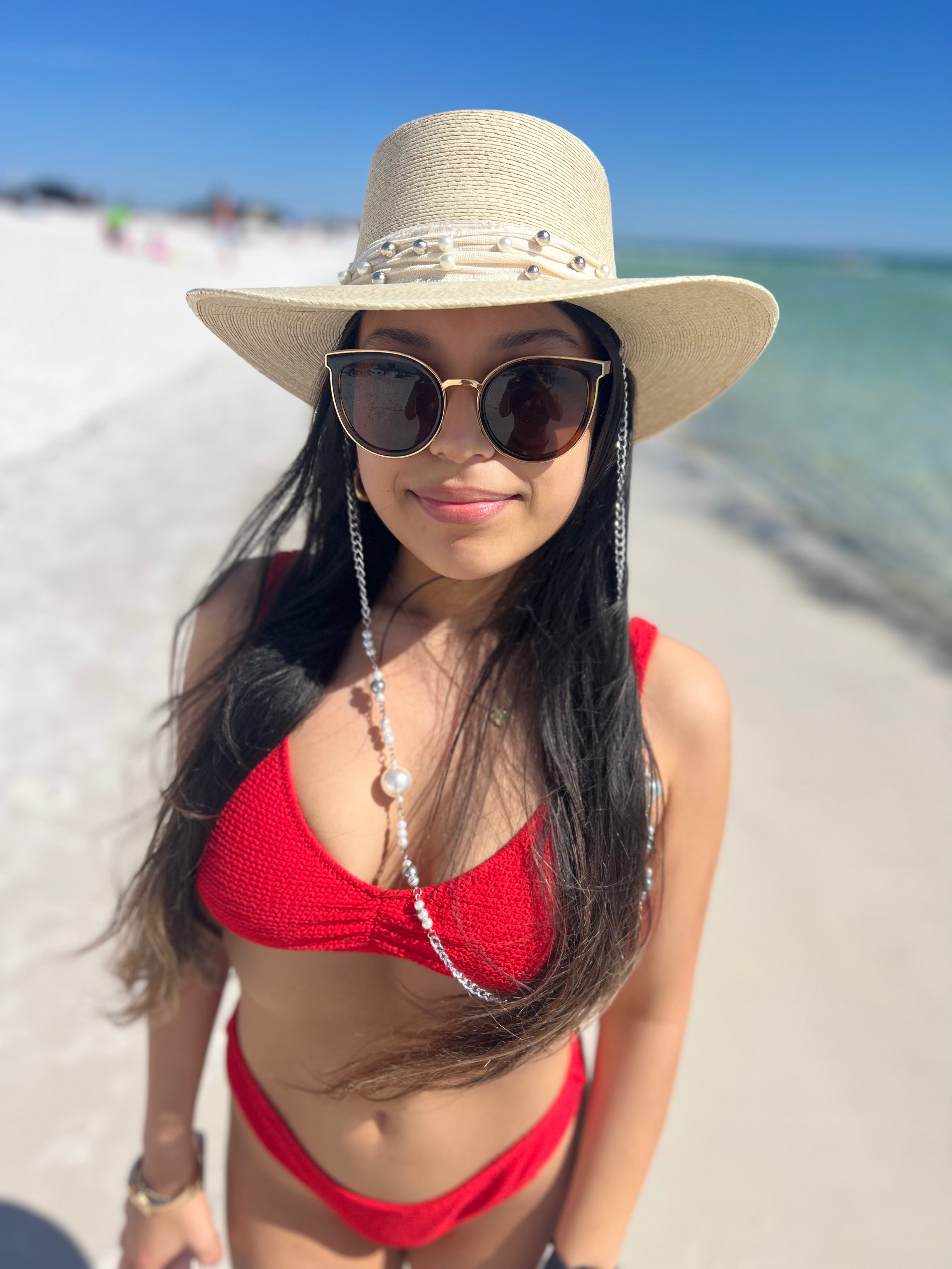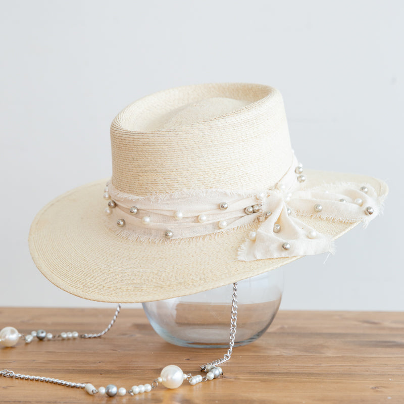 White hard palm hat adorn with a Pearl linen band. This hat dips in the front and back for optimal sun protection. There is a removable Pearl and silver chain to an extra element of luxury