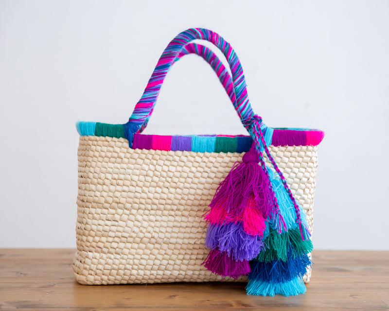 This bag woven with hard palm and hand stitched with colorful yarn and tassel, makes for an eye-catching bag. It is the perfect size to carry any electronics and beach essentials