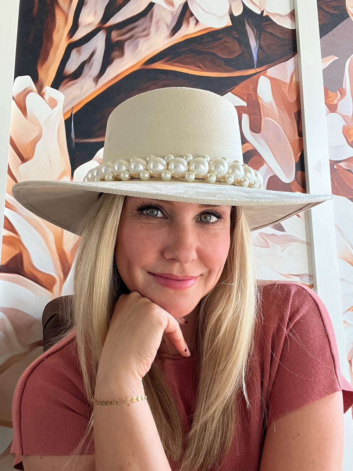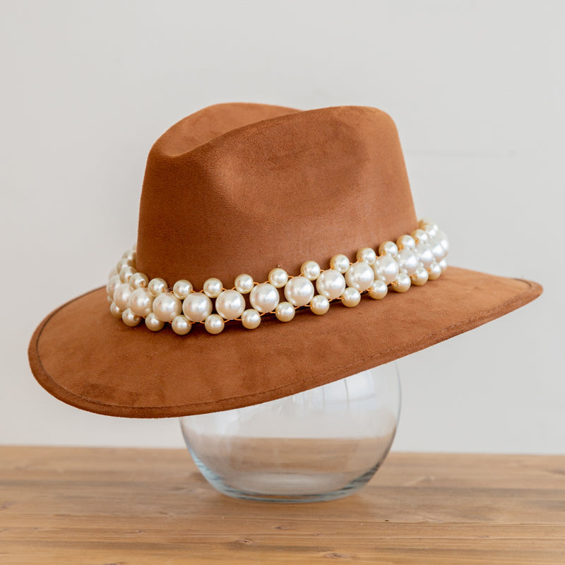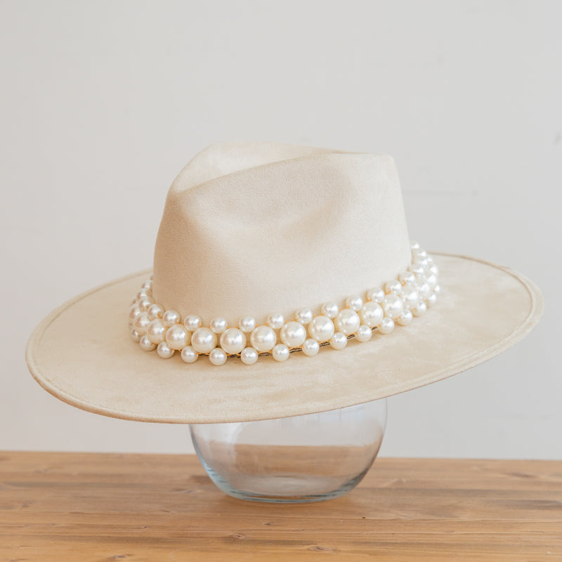 This suede hat, adorned with a thick band of pearls, screams money! It comes in two styles, a large brim and short brim, as well as black and white.
